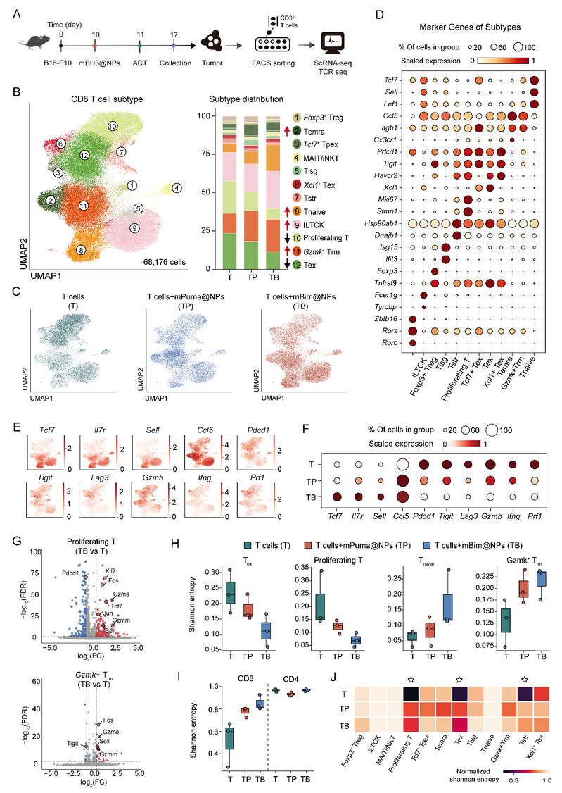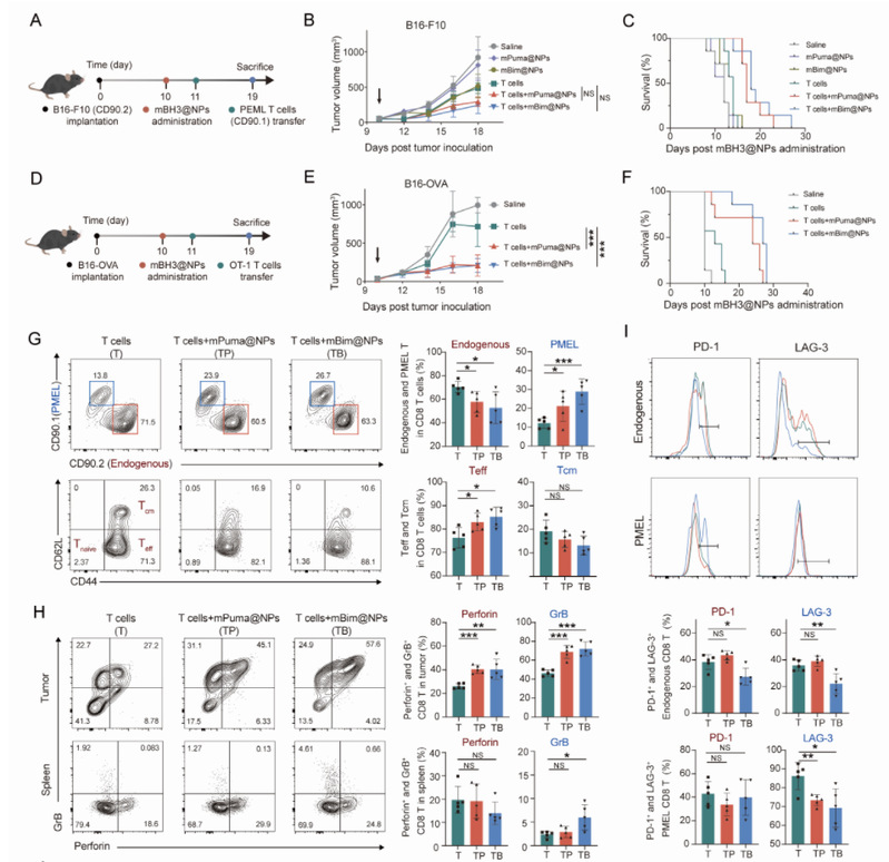 过继性T细胞疗法(Adoptive T cell therapy,ACT)作为肿瘤免疫治疗的重要策略,已在血液肿瘤中取得显著临床成效。然而,其在实体瘤中的疗效仍面临严峻挑战。一方面,肿瘤细胞通过上调BCL-2、MCL-1等抗凋亡家族蛋白获得凋亡抵抗,使浸润至肿瘤部位的过继性T细胞难以有效杀伤靶细胞;同时,实体瘤免疫抑制微环境进一步制约T细胞浸润与功能持久性。因此,亟需开发协同增效过继性T细胞疗法的联合治疗策略。近年来,通过调控肿瘤细胞内在线粒体凋亡通路以增敏免疫杀伤,已成为突破上述瓶颈的新兴策略。 3月31日,生命科学学院金勇丰团队在Cell Reports Medicine杂志在线发表题为“mRNA lipid nanoparticle-mediated mitochondrial apoptosis augments adoptive T cell immunotherapy”的研究论文。该研究开发了一种基于mRNA/LNP的线粒体凋亡启动策略,通过编码促凋亡BH3结构域协同增效过继性T细胞疗法,为实体瘤免疫治疗提供了全新思路。 一、理性设计:从“释放刹车”到“施加加速” 研究团队首先对mRNA分子进行理性设计。不同于传统BH3模拟物仅能靶向单一抗凋亡蛋白(释放刹车),该研究选取仅BH3结构域蛋白家族中的直接激活剂作为编码序列,不仅可广谱抑制多个抗凋亡蛋白,更能直接激活效应蛋白(施加加速),从机制上规避单一靶点抑制导致的耐药问题。为进一步增强BH3结构域的稳定性与靶向结合能力,团队将其与Stefin A四联体适配体支架融合,通过构象约束使其以最优取向与胞内靶蛋白互作。经系统筛选,mPuma@NPs与mBim@NPs制剂在多种肿瘤细胞中展现出最强的促凋亡效力,且对非癌细胞具有选择性杀伤优势,为后续联合治疗研究奠定基础(图1)。 图1: 支架融合的mBH3@NPs在体外强烈诱导肿瘤细胞凋亡 二、体内外协同疗效:从凋亡增敏到缓解T细胞功能衰竭 研究团队进一步在体内外系统评估了mBH3@NPs制剂与过继性T细胞的协同效应。体外研究表明,mBH3@NPs通过激活内源性线粒体凋亡途径有效触发肿瘤细胞程序性死亡,进而促进树突状细胞成熟与抗原交叉提呈。mBH3@NPs预处理通过双重机制协同增效过继性T细胞:一方面降低肿瘤细胞凋亡阈值,使其对T细胞杀伤更为敏感;另一方面有效改善T细胞代谢状态,缓解功能耗竭,并促进其向记忆表型分化(图2)。进一步地,研究团队在多种实体瘤模型中验证了mBH3@NPs与过继性T细胞疗法序贯联用展现出卓越的协同抗肿瘤效果,显著抑制肿瘤生长并延长小鼠生存期。流式分析表明,联合治疗赋予内源性T细胞即时杀伤功能,同时促进过继性T细胞向中枢记忆表型转化,为其长期存续与记忆潜能维持提供有利的微环境支持(图3)。 图2:mBH3@NPs降低癌细胞凋亡阈值与缓解T细胞代谢耗竭 图3:mBH3@NPs与过继性T细胞疗法联用提升体内抗肿瘤疗效 三、单细胞图谱解码T细胞命运重塑 为深入揭示联合疗法的免疫调控机制,研究团队借助单细胞转录组测序与TCR测序技术系统描绘了联合治疗对肿瘤浸润T细胞亚群的重塑图谱。结果显示,联合治疗促进肿瘤内CD8⁺ T细胞向记忆样表型转化,显著减轻抗原反应性亚群的克隆优势,拓宽抗肿瘤T细胞库的克隆广度与功能异质性。其中mBim@NPs联合方案在逆转终末耗竭与异常增殖的同时,显著扩增了组织驻留记忆T细胞与先天样细胞毒性T细胞等具有长效抗肿瘤潜力的功能亚群。TCR多样性分析进一步证实,联合治疗使T细胞受体库分布更均衡,为建立持久、广谱的抗肿瘤免疫应答奠定基础(图4)。 图4:单细胞测序揭示联合疗法驱动效应T细胞向TCR多样性扩展的记忆样状态分化 综上所述,该研究开发一种基于mRNA/LNP的联合治疗策略,从细胞死亡、微环境重塑及T细胞命运调控等多个层面系统阐明了利用mRNA/LNP平台启动线粒体凋亡以协同增效过继性T细胞疗法的机制,为突破实体瘤免疫治疗瓶颈提供了新策略与实验依据,也为临床转化奠定了重要基础。 浙江大学生命科学学院博士研究生傅佳燕为论文第一作者,博士研究生刘曜奇、巴德年医学试验班本科生钟振钰等参与该项研究工作。浙江大学生命科学学院金勇丰教授为论文的通讯作者,浙江大学良渚实验室毛圆辉研究员为共同通讯作者。浙江大学药学院王金强研究员和医学院潘荣清研究员为该研究提供了重要指导和帮助。研究得到了国家重点研发计划、国家自然科学基金、浙江大学上海高等研究院繁星科学基金等项目的资助。 | ||||