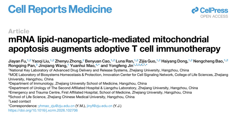 | 浙江大学生命科学学院金勇丰团队在Cell Reports Medicine发文研究开发基于mRNA/LNP的线粒体凋亡启动策略以协同增效过继性T细胞疗法 | ||||